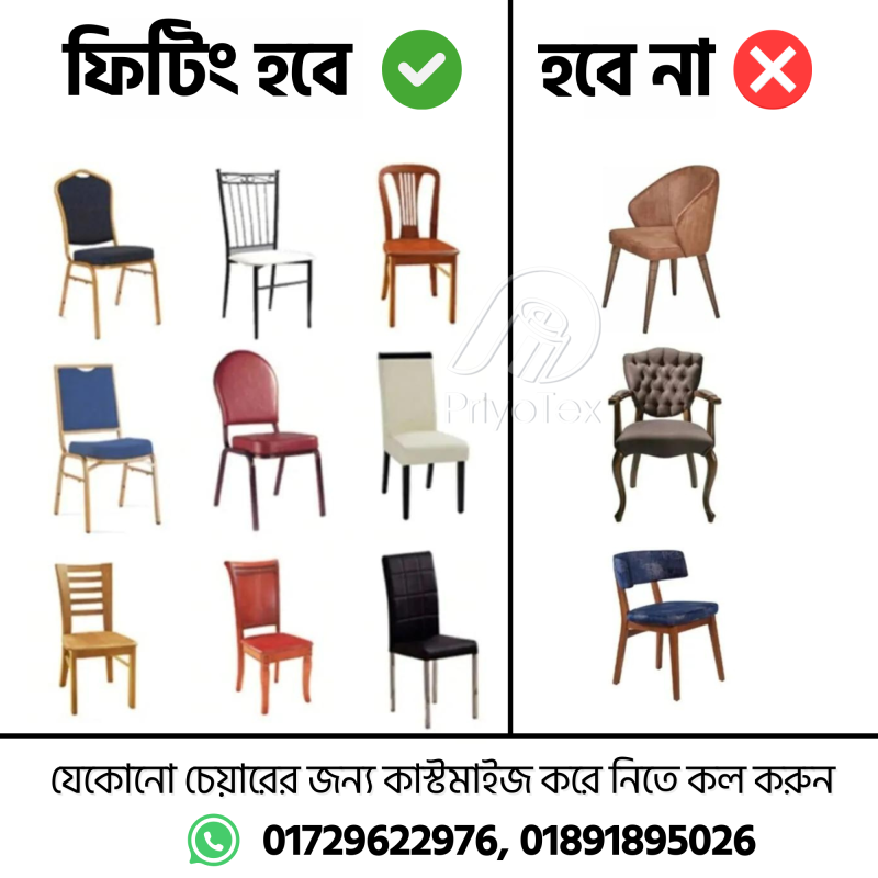 চেয়ার- সেটা কাঠের হোক বা প্লাস্টিকের, ফিটিং হবে ১০০ তে ১০০। ফিটিং নিয়ে টেনশন করতে না চাইলে "প্রিয় টেক্সে" অর্ডার করুন আপনার যাবতীয় ফার্নিচারের কভার।
